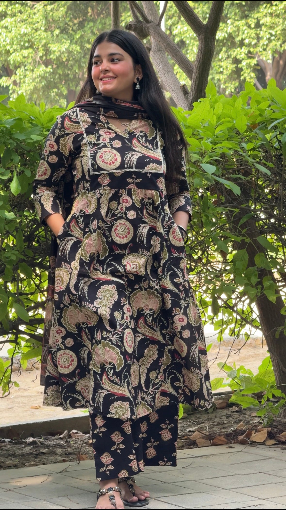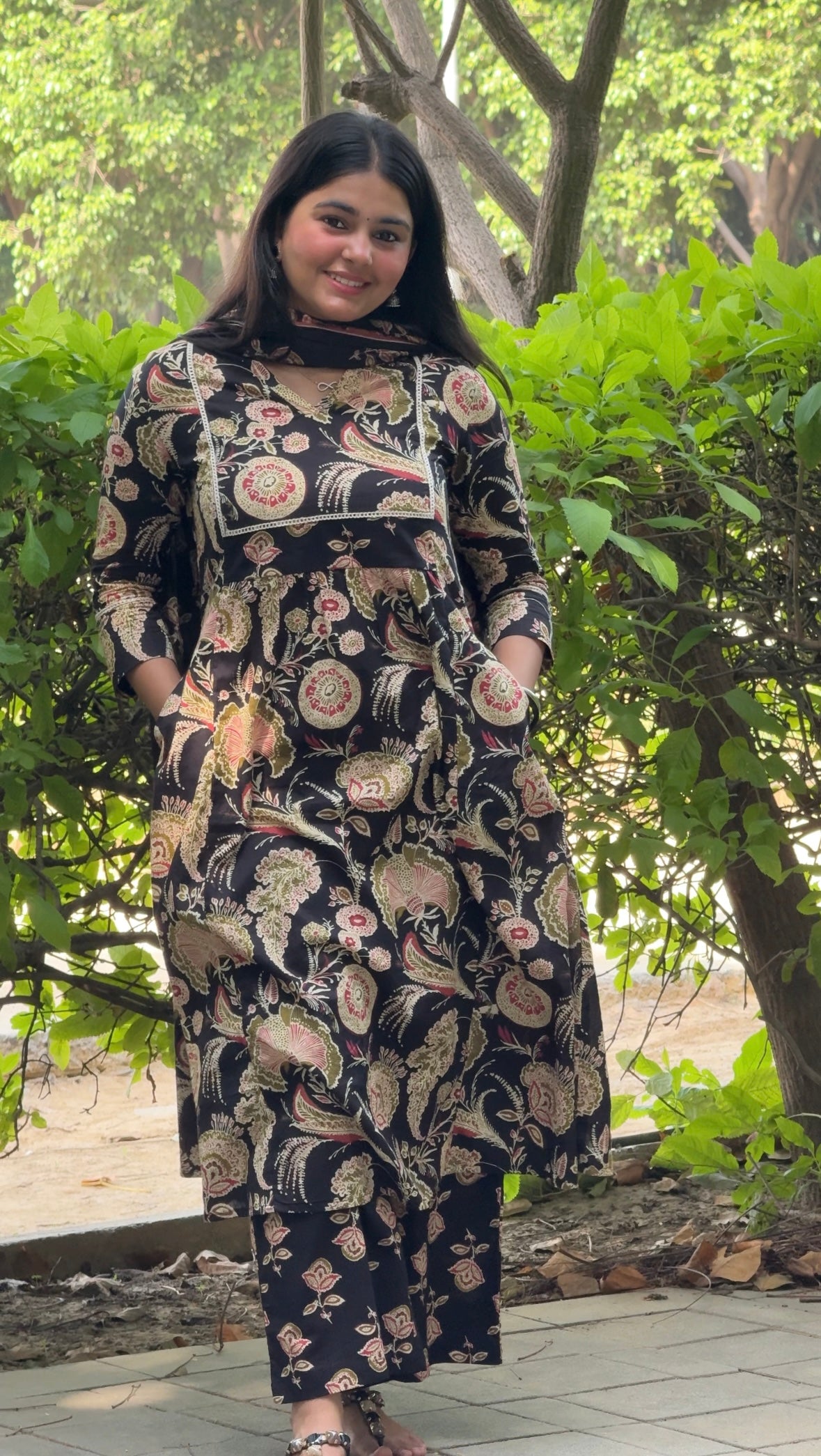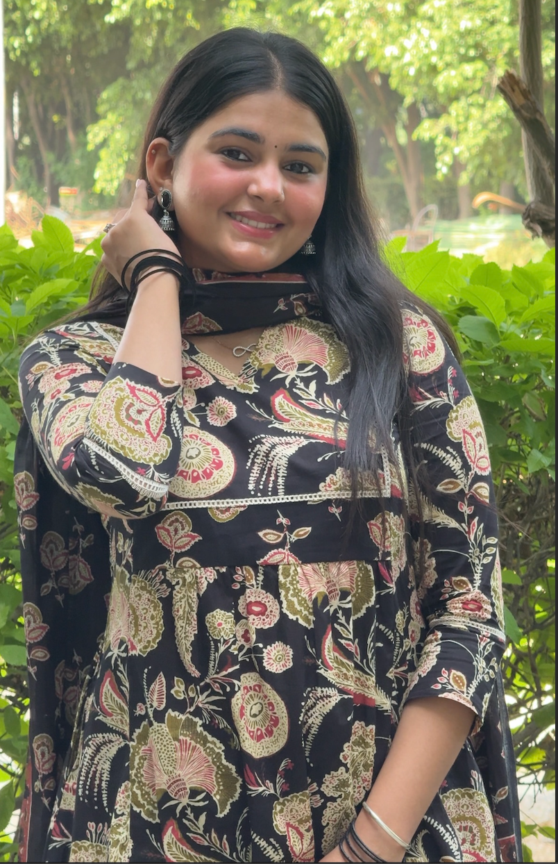 Add a touch of timeless charm to your ethnic wardrobe with this stunning black printed kurta set. This elegant three-piece ensemble includes a stylish kurta, matching pants, and a dupatta, all crafted with a beautiful floral and paisley print that gives it a modern, sophisticated look. The comfortable fabric and practical design make it perfect for everyday wear.